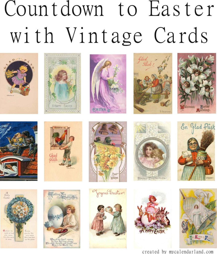 A selection of vintage Easter cards can serve as a countdown calendar, but most people use it as a lovely Easter decor. We used images created by renowned postcard artists: Frances Brundage, Ellen Clapsaddle, Jenny Nystrom, Samuel Schmucker, and Georg Stoopendaal. More of their work (and other artists’) is available in our article about antique Easter postcards.