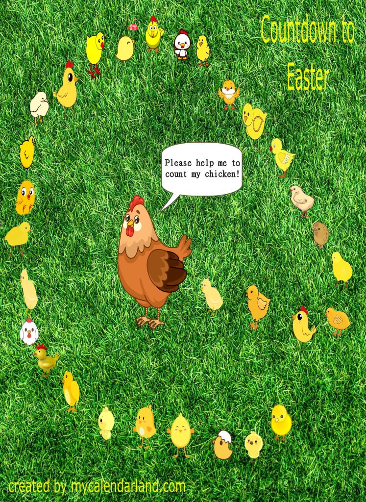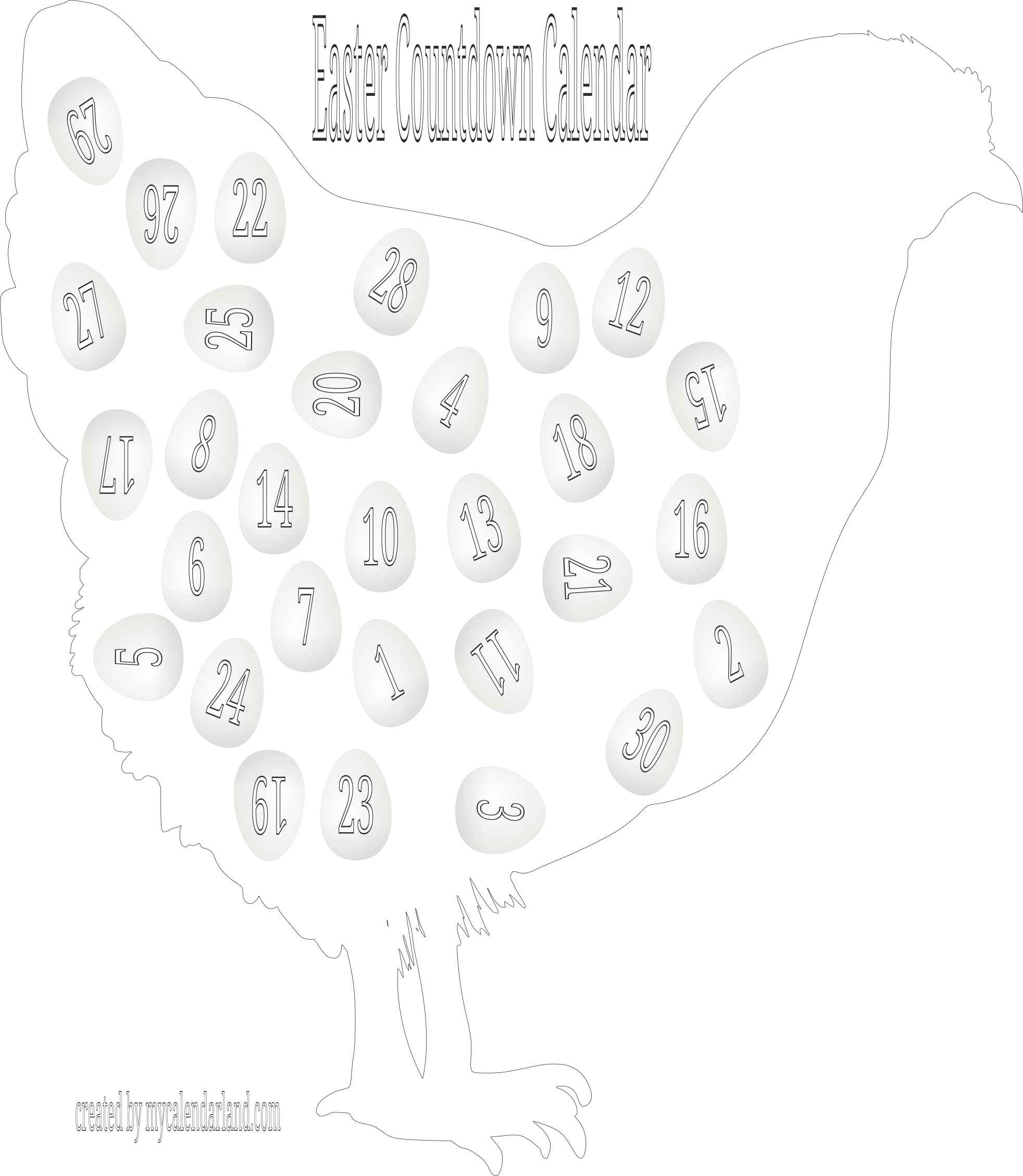 Another popular symbol of eternal life cycles is an egg. Here we go with a hen and thirty eggs, one for each day until Easter. This simple printable Easter countdown calendar gives kids a nice opportunity to actively participate in counting, simple math operations, and coloring. Parents, of course, can use such a printable to introduce numerous themes for a debate.