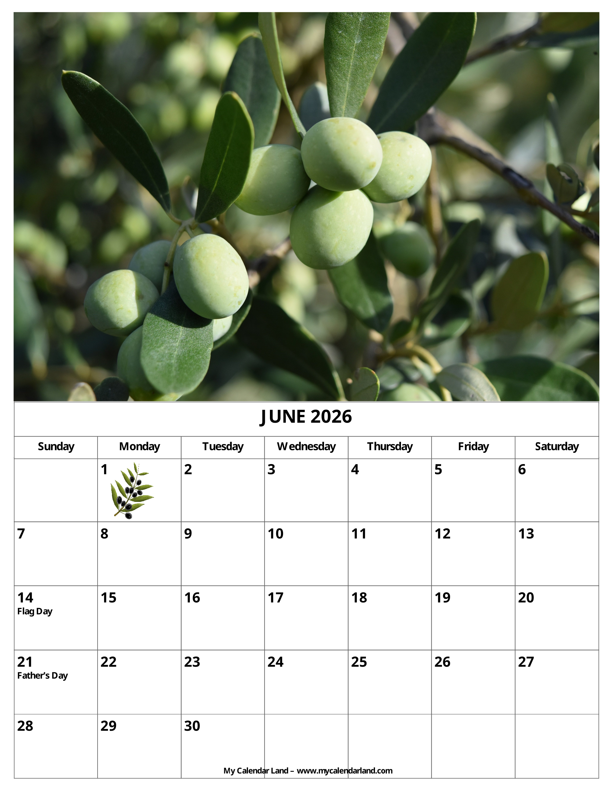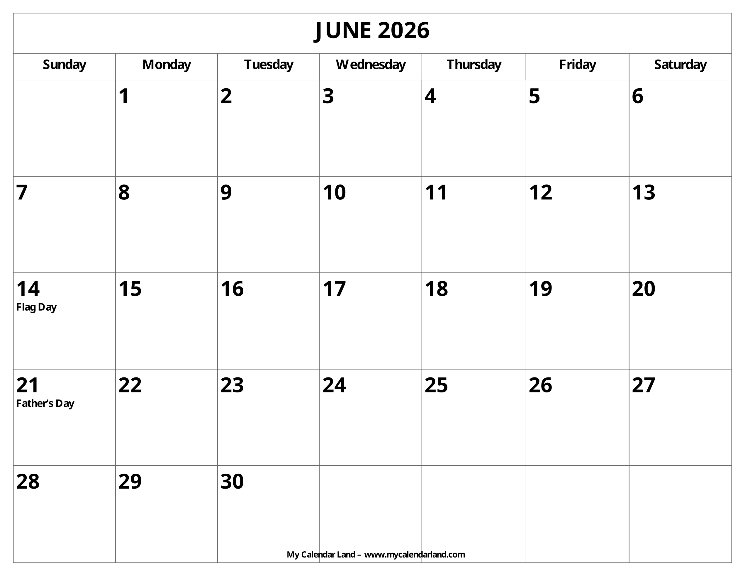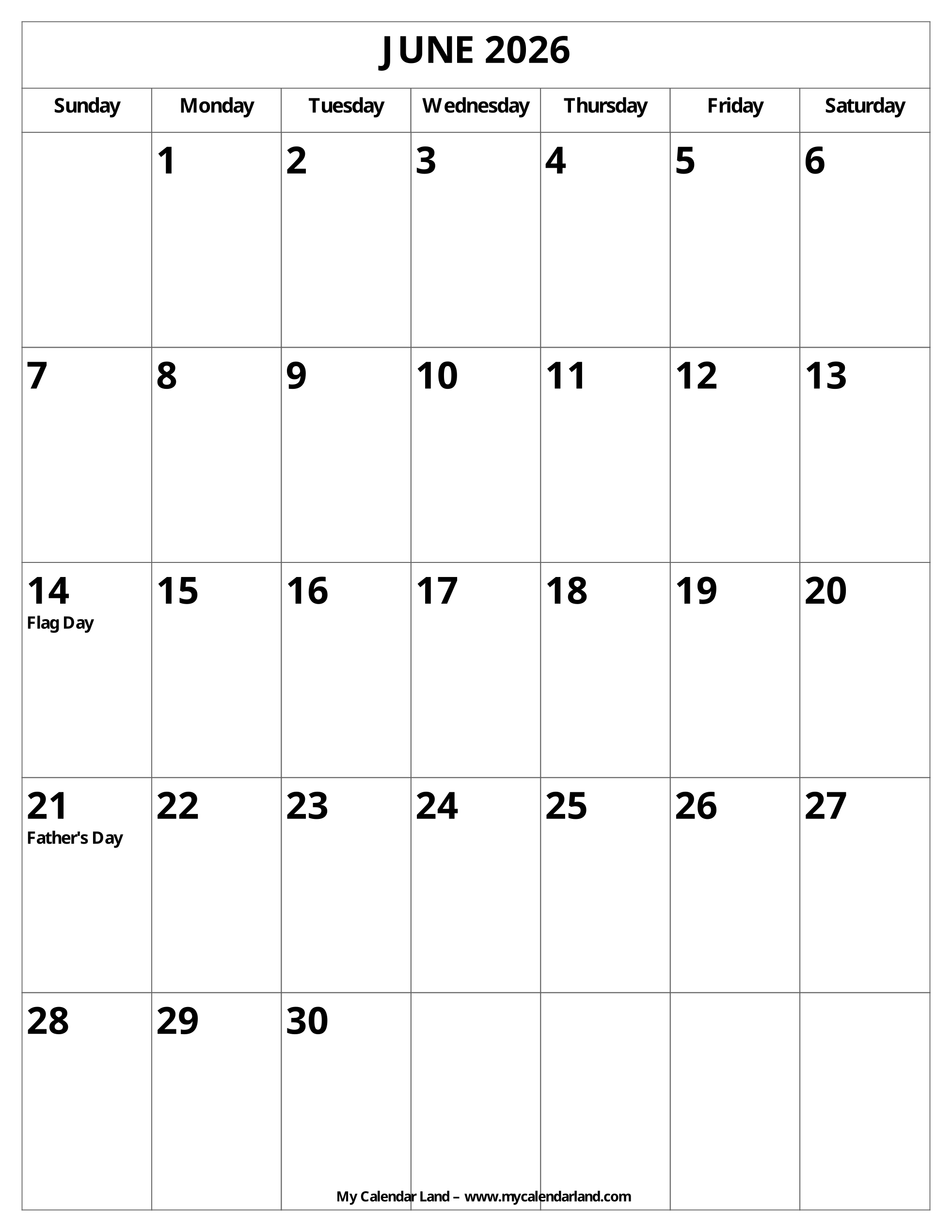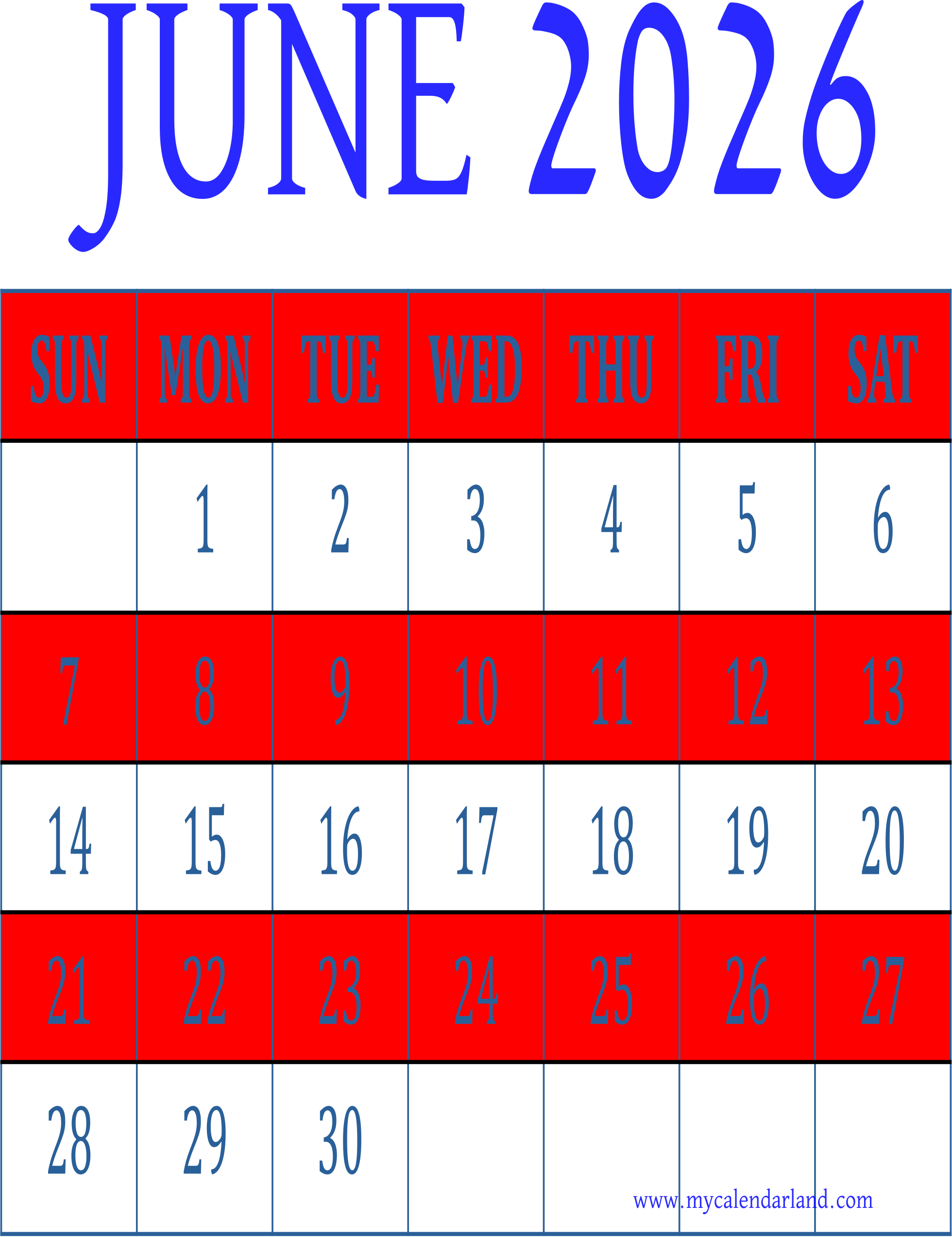 Printable Monthly Calendar June 2026
