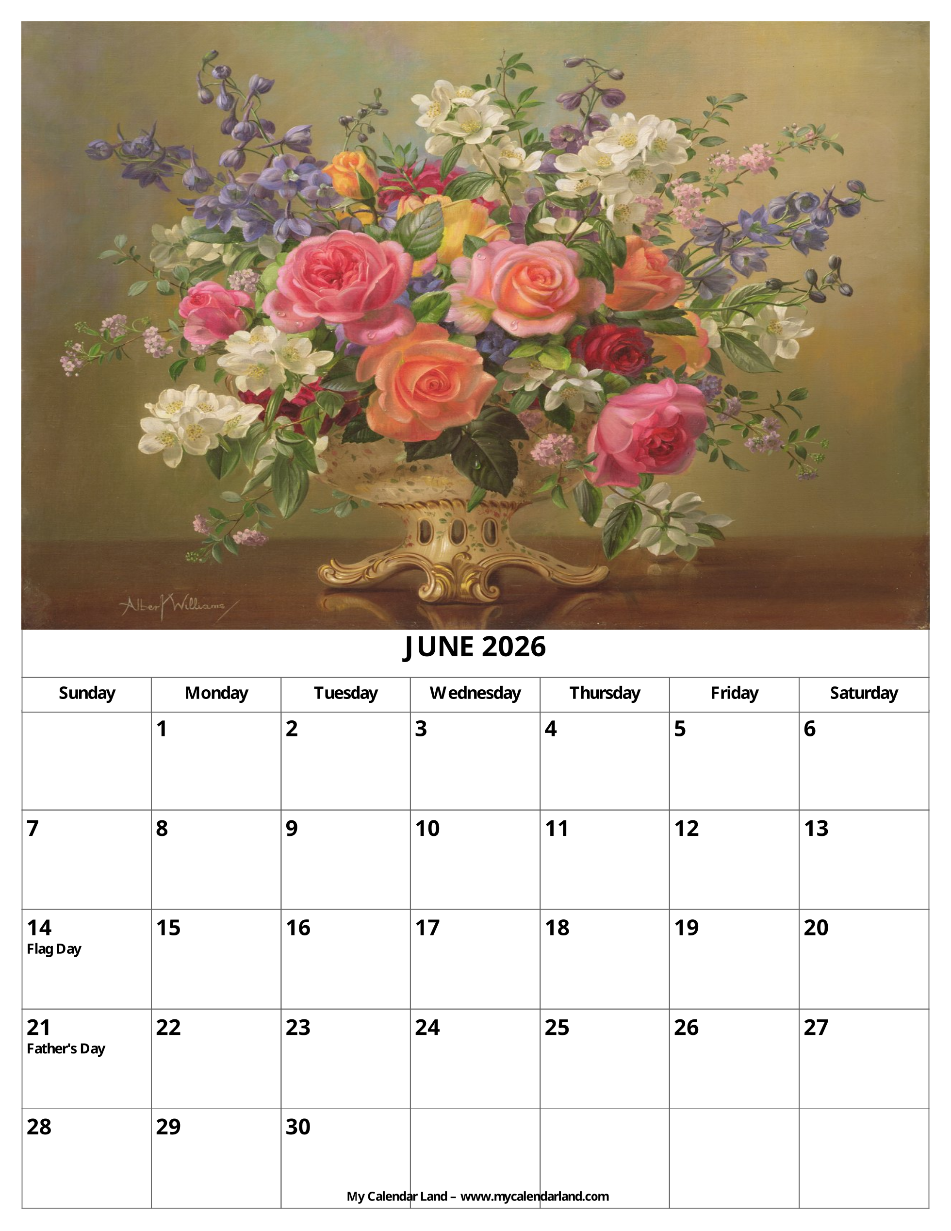 Here are some beautiful free monthly calendars with flowers for June 2026: